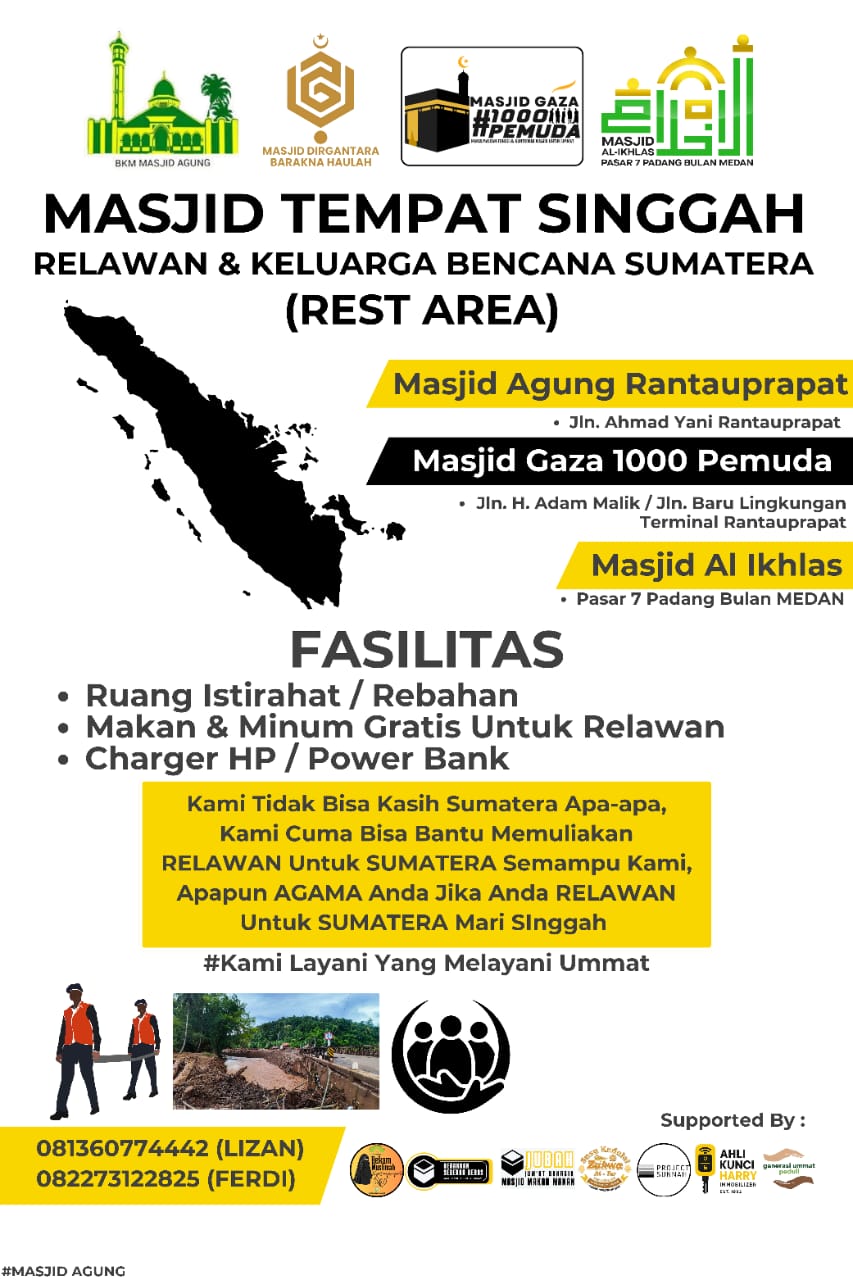 Di tengah intensitas penanganan bencana di sejumlah wilayah Sumatera, peran rumah ibadah kembali menunjukkan fungsi sosialnya. Sejumlah masjid di dua kota berbeda secara resmi membuka layanan Rest Area Relawan sebagai bentuk kepedulian kemanusiaan bagi para relawan dan keluarga terdampak bencana.