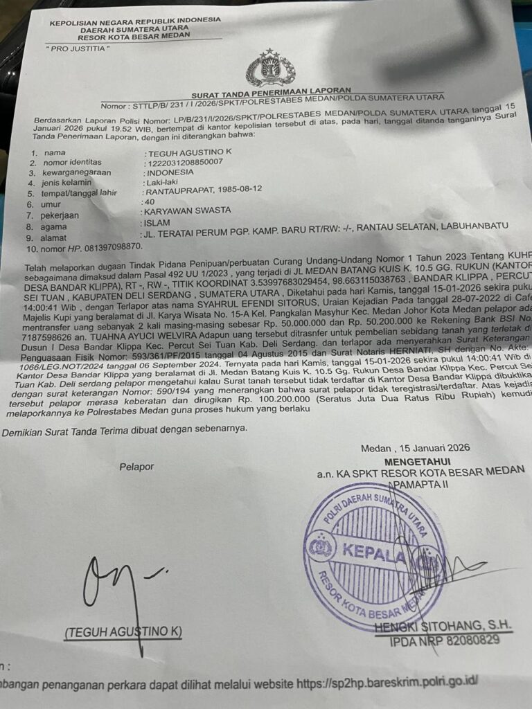 Kasus ini telah dilaporkan ke Polrestabes Medan pada 15 Januari 2026 dengan nomor laporan: STTLP/B/231/I/2026/SPKT/POLRESTABES MEDAN/POLDA SUMATERA UTARA.