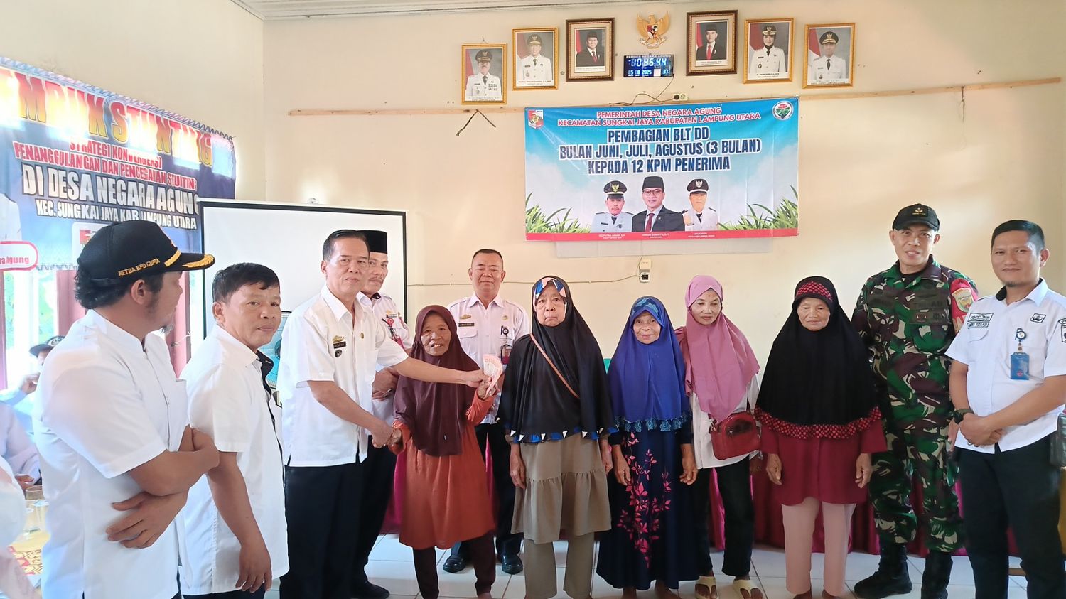 Pemerintah Desa (Pemdes) Negara Agung, Kecamatan Sungkai Jaya, Kabupaten Lampung Utara, salurkan Bantuan Langsung Tunai Dana Desa (BLT DD) bulan Juni, Juli dan Agustus Tahun Anggaran 2025 kepada 12 KPM Desa Negara Agung, di Kantor Desa Negara Agung, Kecamatan Sungkai Jaya, Kabupaten Lampung Utara, Rabu, (6/8/25).