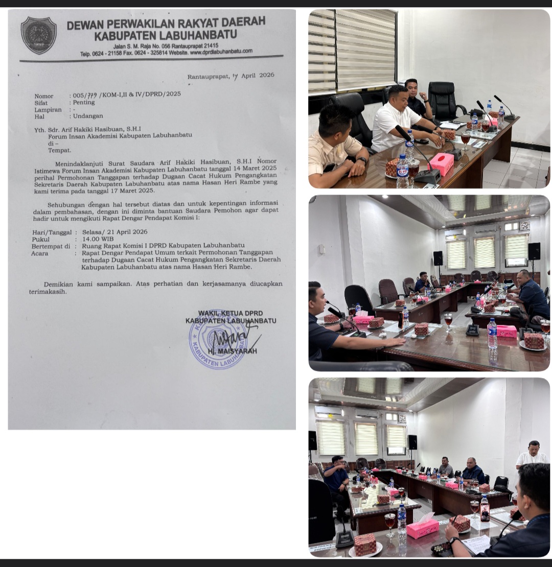 Rapat Dengar Pendapat (RDP) Komisi I DPRD Kabupaten Labuhanbatu terkait dugaan cacat hukum dalam pengangkatan Sekretaris Daerah (Sekda) atas nama Hasan Heri Rambe berlangsung tanpa kehadiran pihak yang paling disorot, yakni Pemerintah Kabupaten (Pemkab) Labuhanbatu.