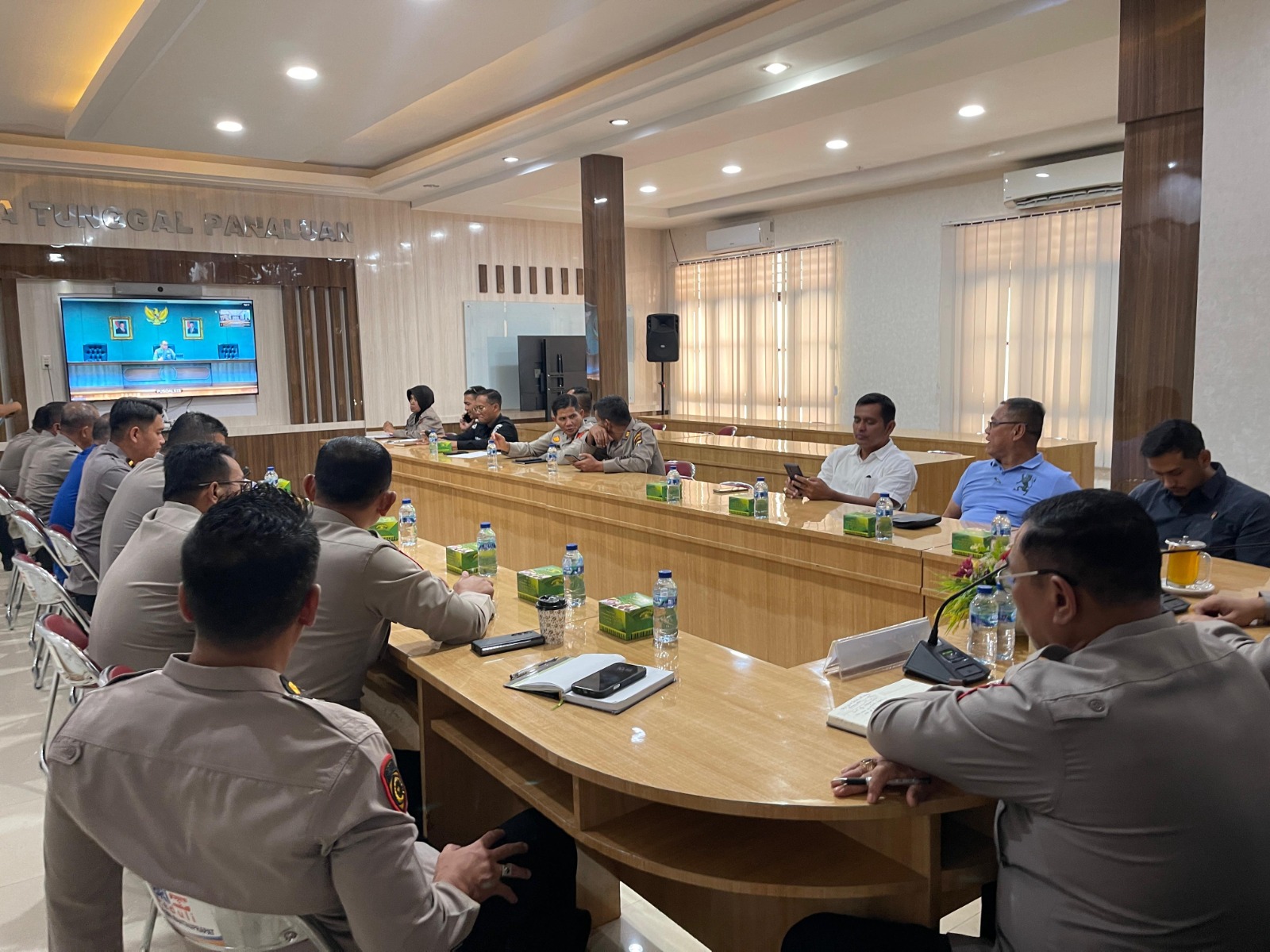 Kapolres Labuhanbatu AKBP Choky Sentosa Meliala, S.I.K., S.H., M.H., bersama para Pejabat Utama (PJU) Polres Labuhanbatu mengikuti kegiatan Zoom Meeting kesiapan menghadapi bencana yang digelar di Aula Tunggal Panaluan Mapolres Labuhanbatu, Jalan M.H. Thamrin, Rantauprapat, Kabupaten Labuhanbatu, Selasa (28/10/2025).