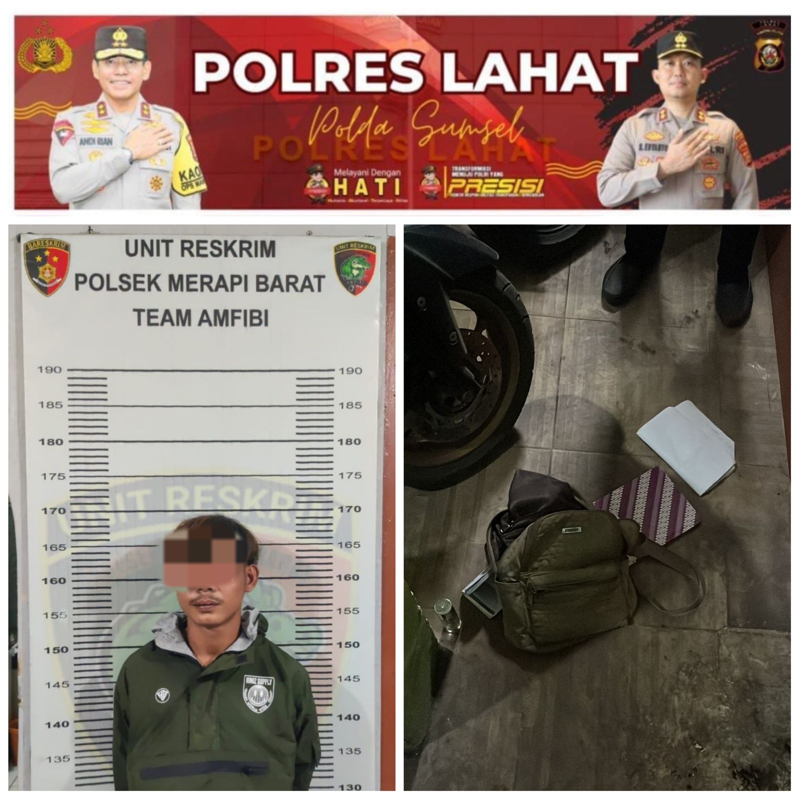 Setelah dilakukan penyelidikan intensif, pada Sabtu, 8 November 2025 sekitar pukul 19.00 WIB, Kapolsek Merapi Barat bersama tim yang diback-up oleh Tim Jagal Bandit Polres Lahat, berhasil menangkap tersangka Safril Mahendra di kawasan Penghijauan, Kelurahan Bandar Jaya, Kecamatan Lahat, Kabupaten Lahat.