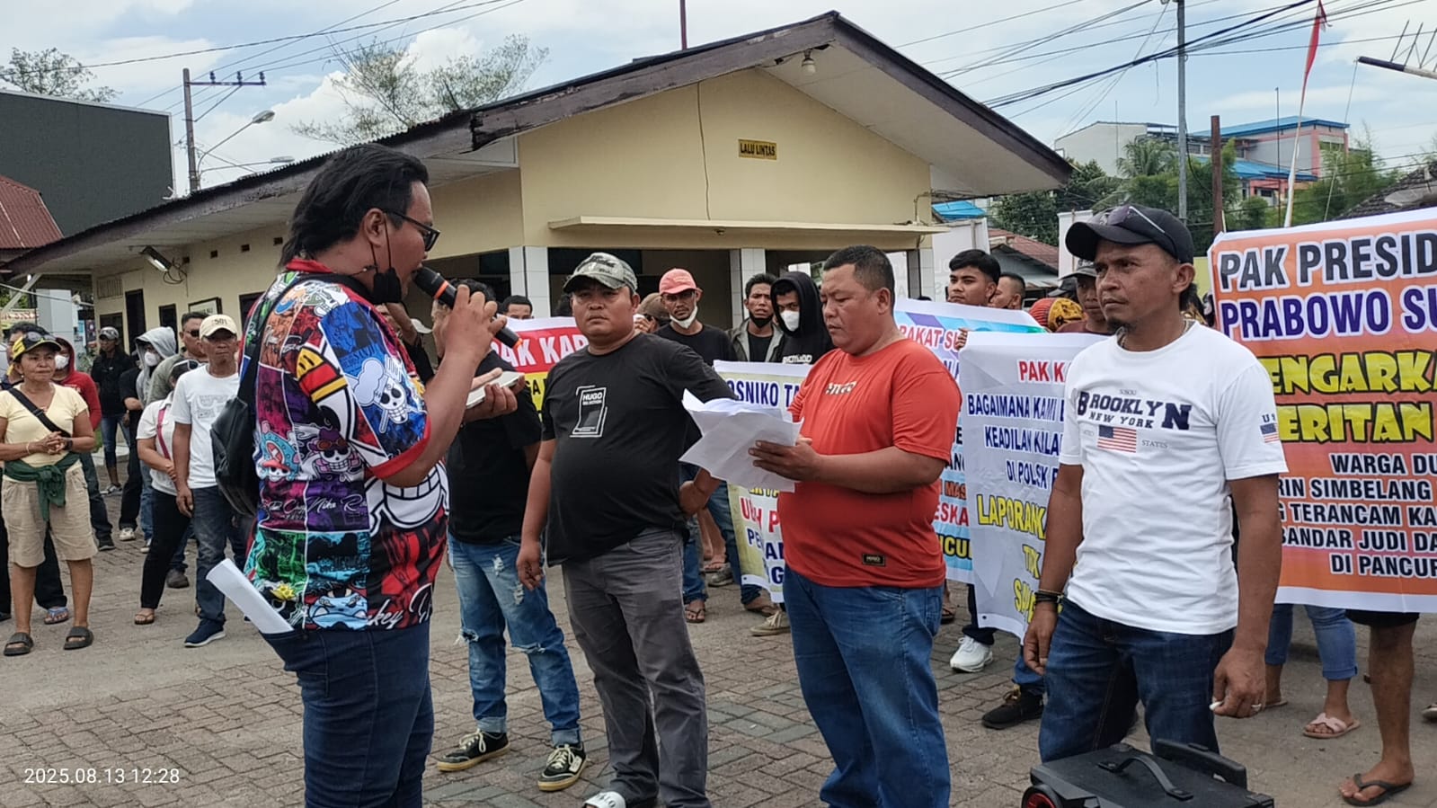 Ratusan warga Desa Durin Simbelang, Kecamatan Pancur Batu bersama Aliansi Masyarakat Sumut mendemo Polsek Pancur Batu membawa spanduk bertuliskan “ Copot Kapolsek dan Kanit Reskrim Polsek Pancur Batu yang di anggap tidak mampu mengungkap kejahatan di desa Durin Simbelang, pada rabu 13 Agustus 2025.